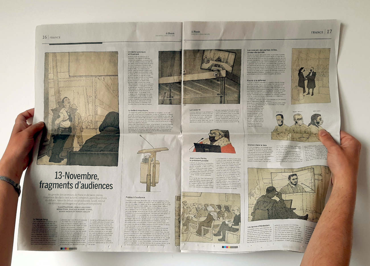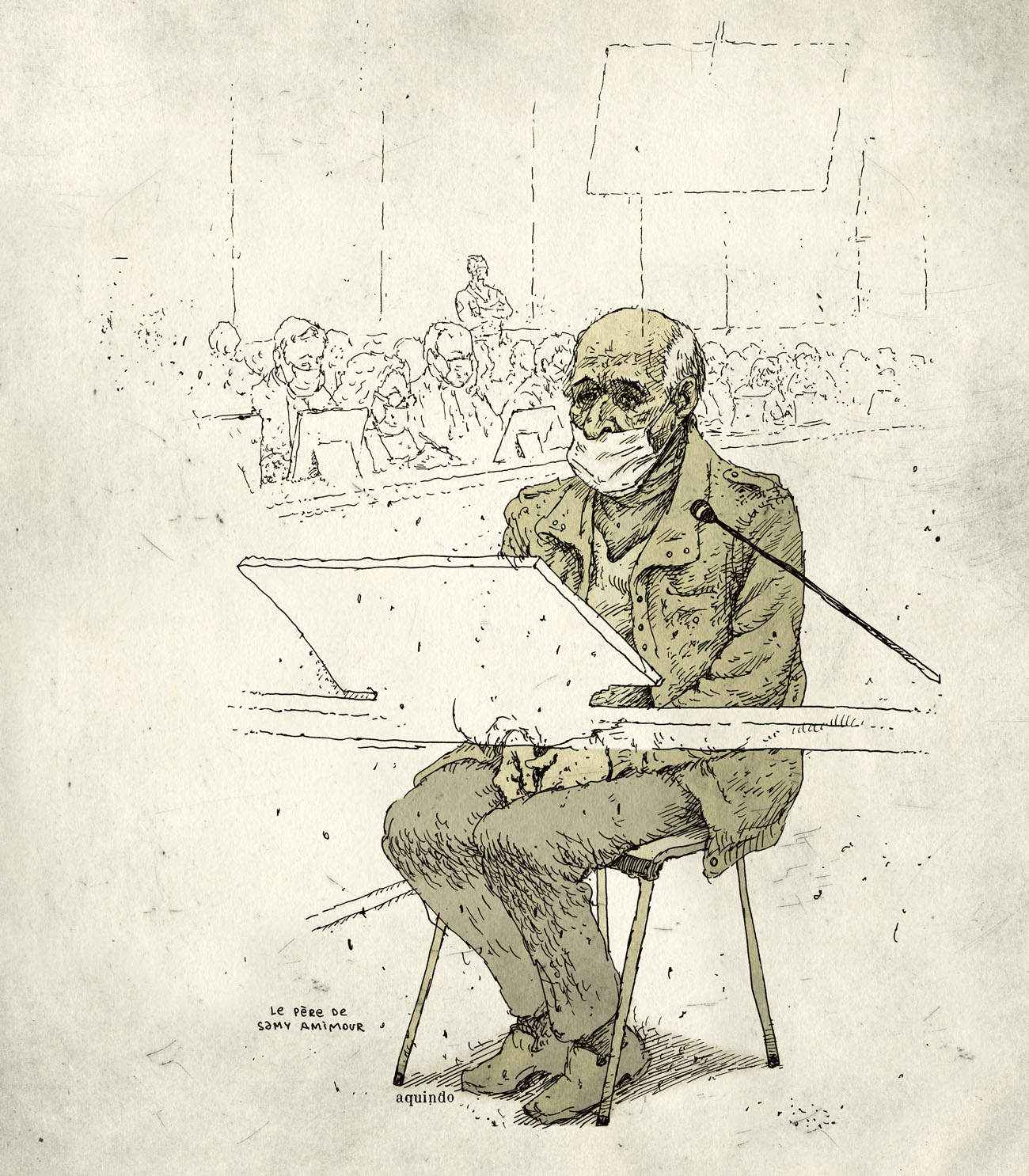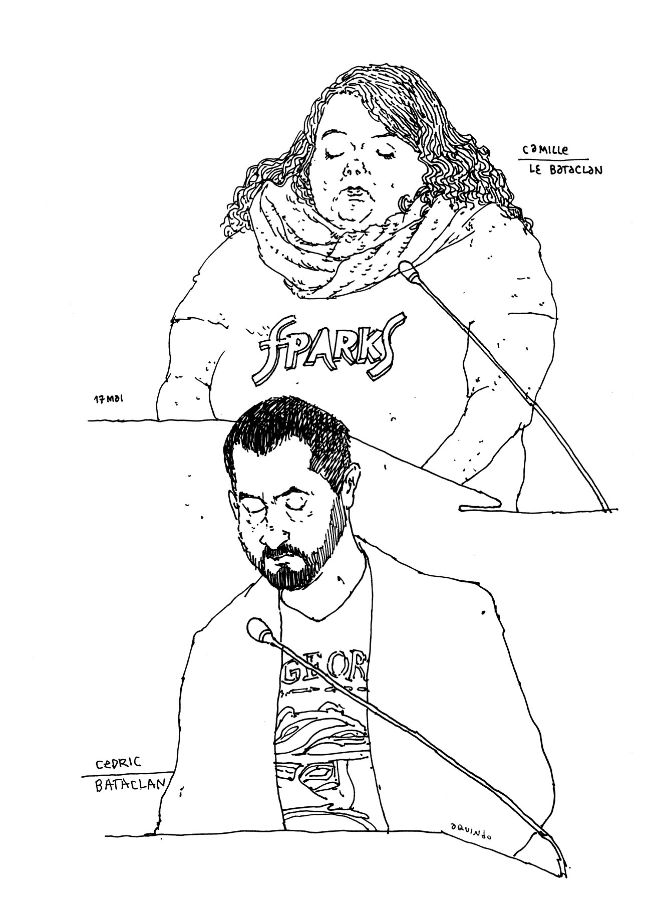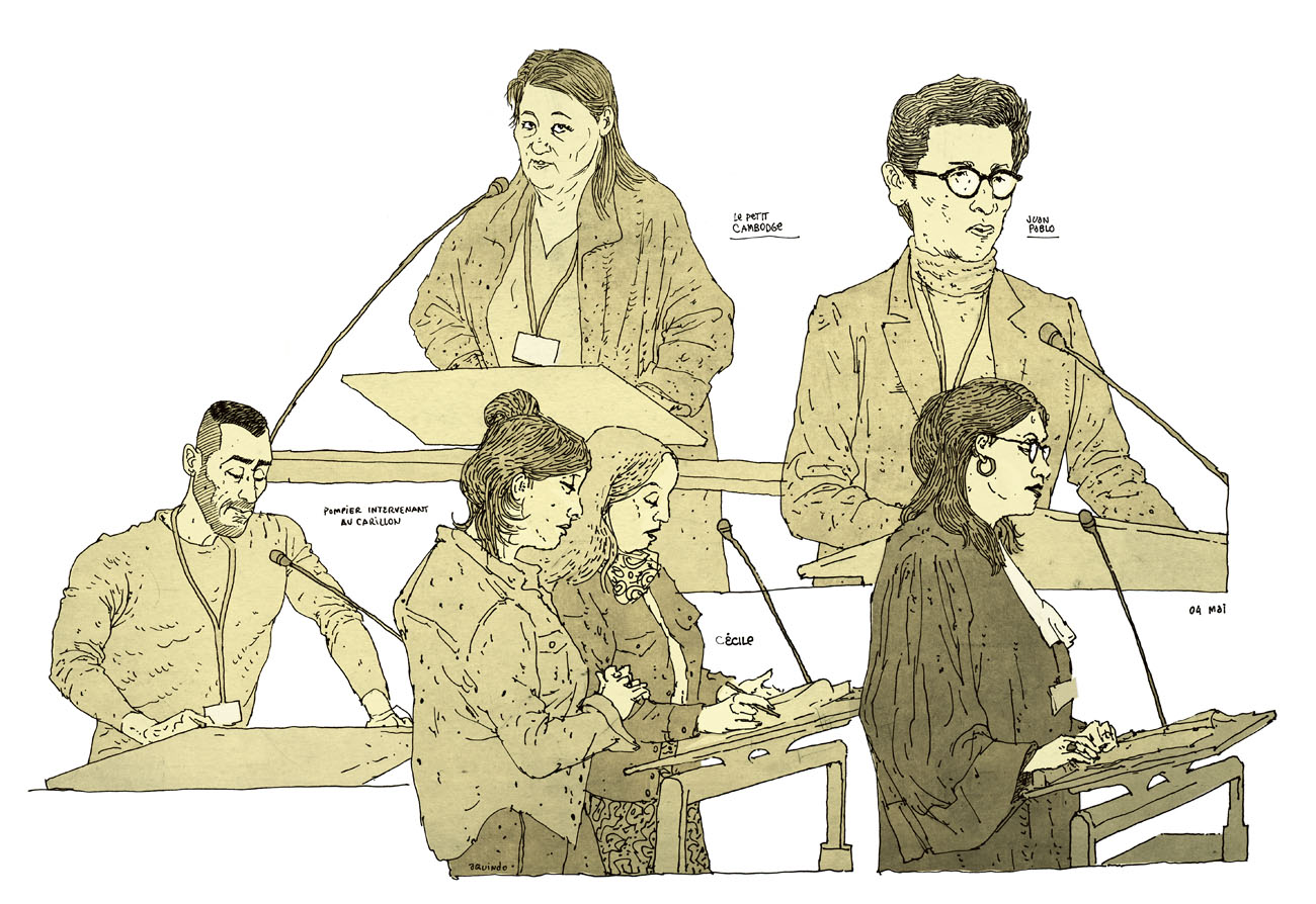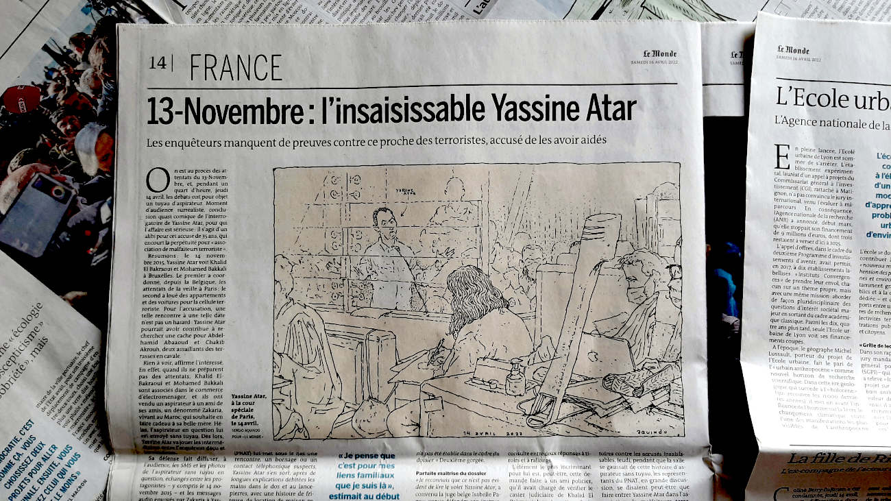 De septembre 2021 à juin 2022 j’ai suivi pour Le Monde le procès des attentats du 13 novembre 2015 au Palais de Justice de Paris. Un défi humain et artistique, d’autant que c’était ma première expérience dans le « dessin judiciaire ». Il fallait dessiner sur des bancs pas très confortables, suivre les témoignages éprouvants des familles endeuillées, des survivants, des accusés, croiser leur regard, visionner des vidéos épouvantables et cela, tout en veillant à garder un trait précis, libre, et sensible à la fois. Un des moments marquants fut l’audition d’un des parents des terroristes du Bataclan, incapable de répondre des actes de son fils. Aussi, la dignité des familles des victimes et des survivants forçait le respect, tout comme le travail des avocats de la défense pour faire entendre une autre musique, au sein de ce « procès cathédrale » où tout semblait joué d’avance. Une synthèse de cette expérience figure dans mon livre « Tout va mal », publié aux éditions Rackham en 2025.