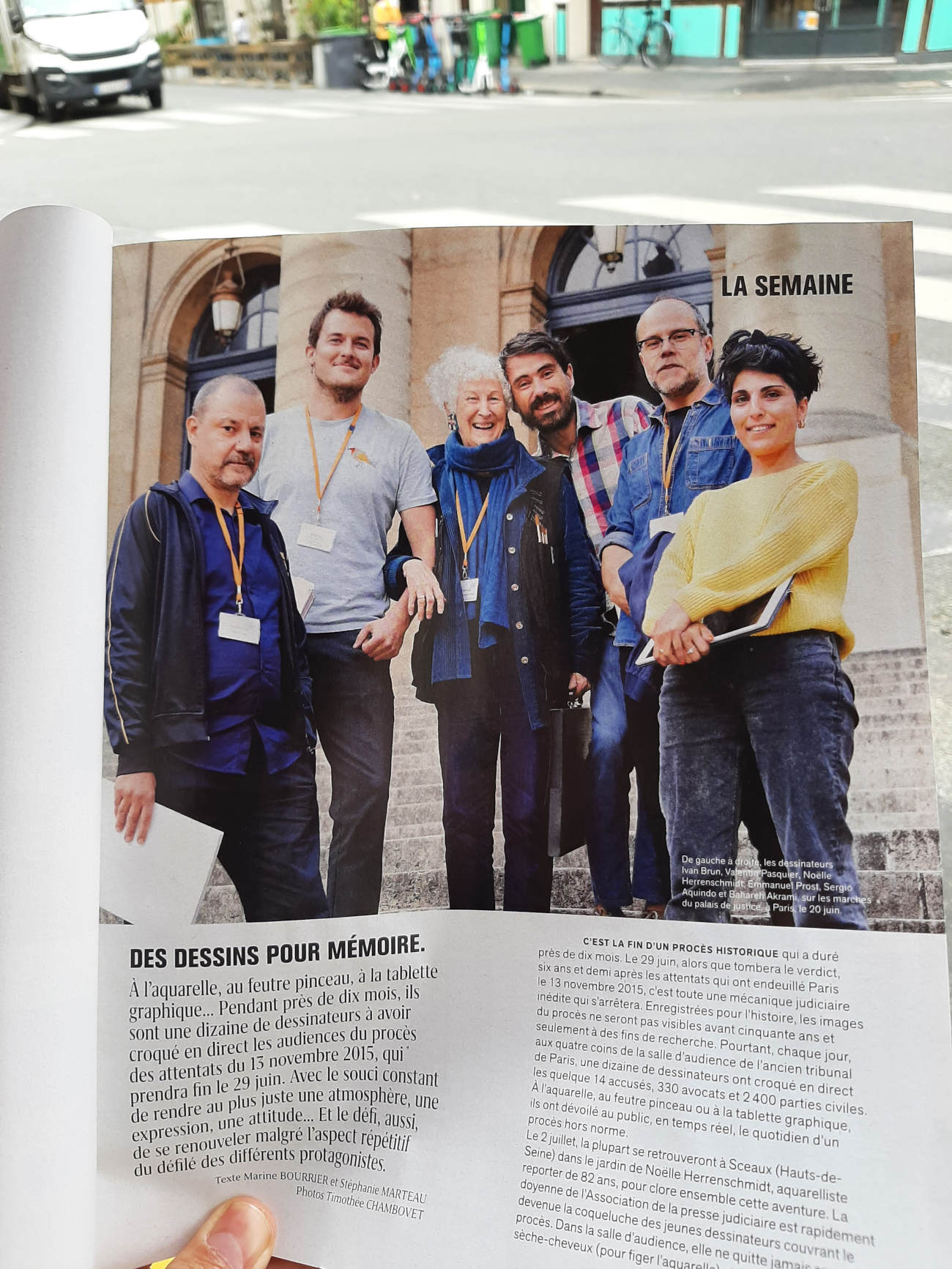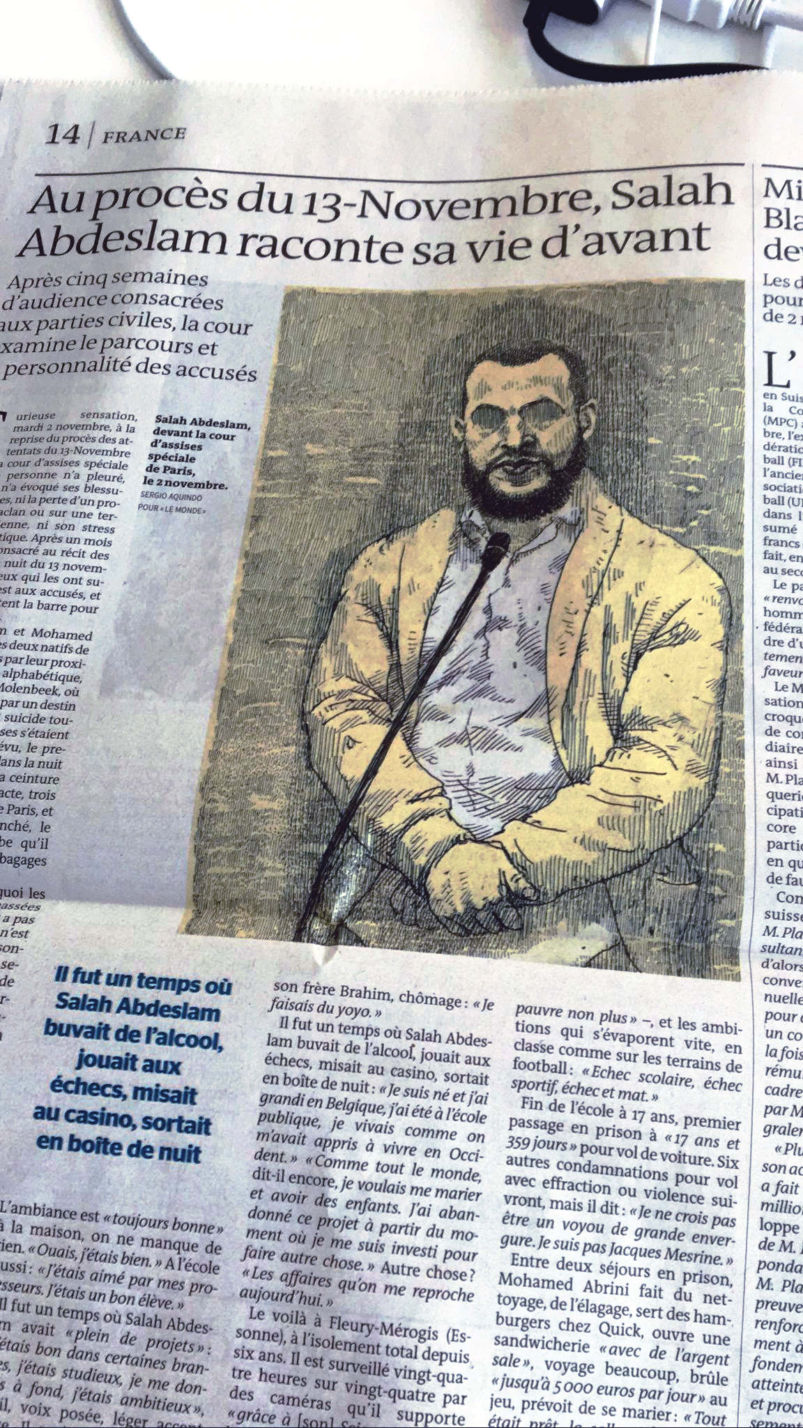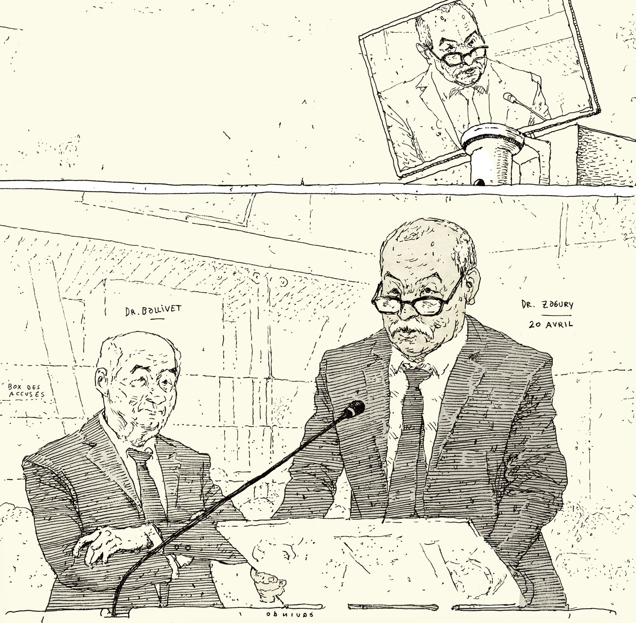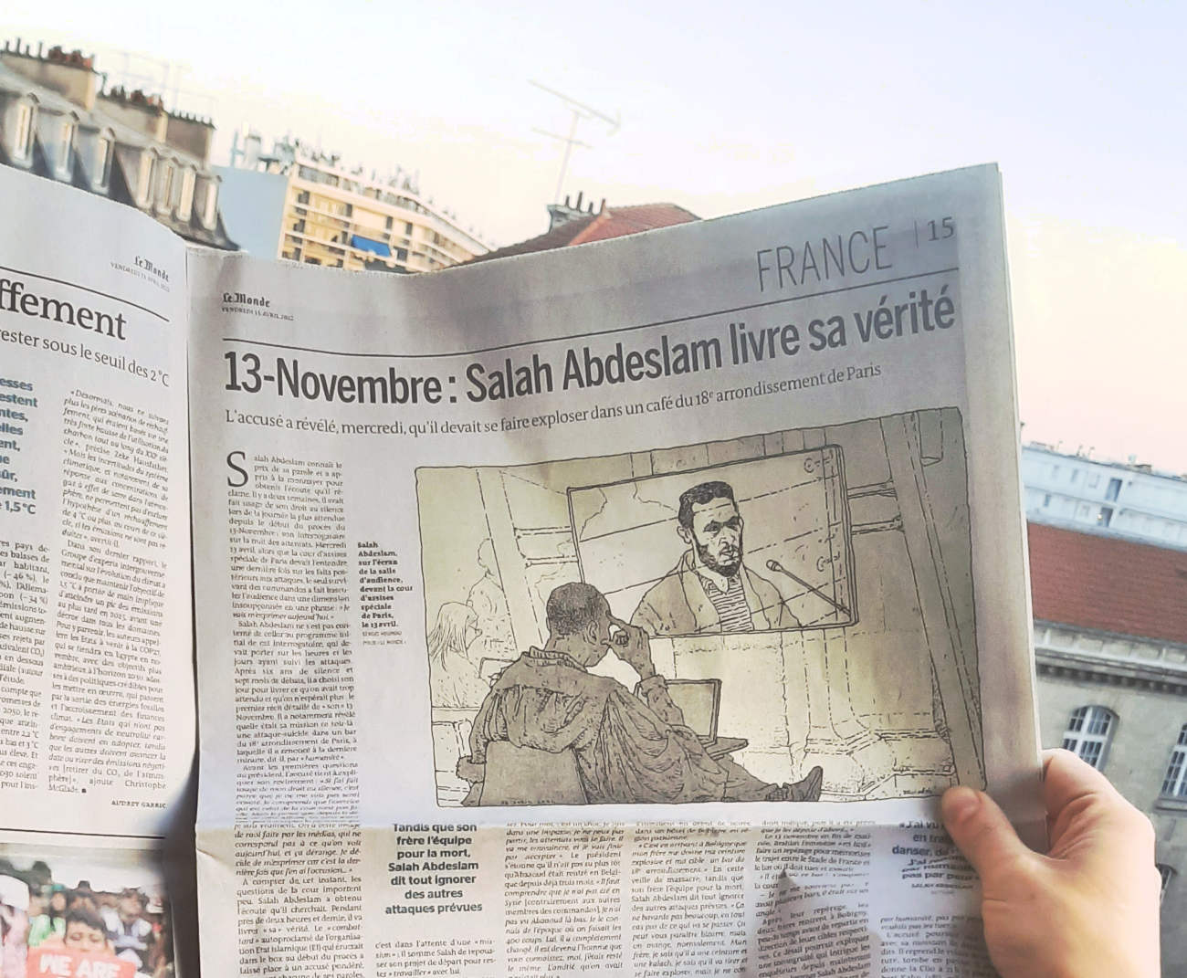 De septembre 2021 à juin 2022 j’ai suivi pour Le Monde le procès des attentats du 13 novembre 2015 au Palais de Justice de Paris. Un défi humain et artistique, d’autant que c’était ma première expérience dans le « dessin judiciaire ». Il fallait dessiner sur des bancs pas très confortables, suivre les témoignages éprouvants des familles endeuillées, des survivants, des accusés, croiser leur regard, visionner des vidéos épouvantables et cela, tout en veillant à garder un trait précis, libre, et sensible à la fois. Un des moments marquants fut l’audition d’un des parents des terroristes du Bataclan, incapable de répondre des actes de son fils. Aussi, la dignité des familles des victimes et des survivants forçait le respect, tout comme le travail des avocats de la défense pour faire entendre une autre musique, au sein de ce « procès cathédrale » où tout semblait joué d’avance. Une synthèse de cette expérience figure dans mon livre « Tout va mal », publié aux éditions Rackham en 2025.