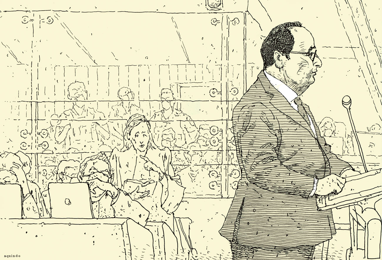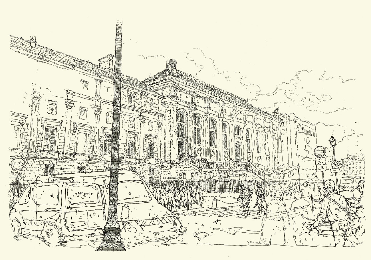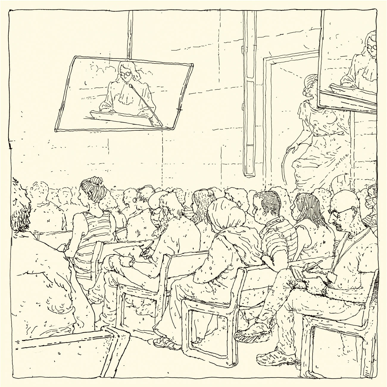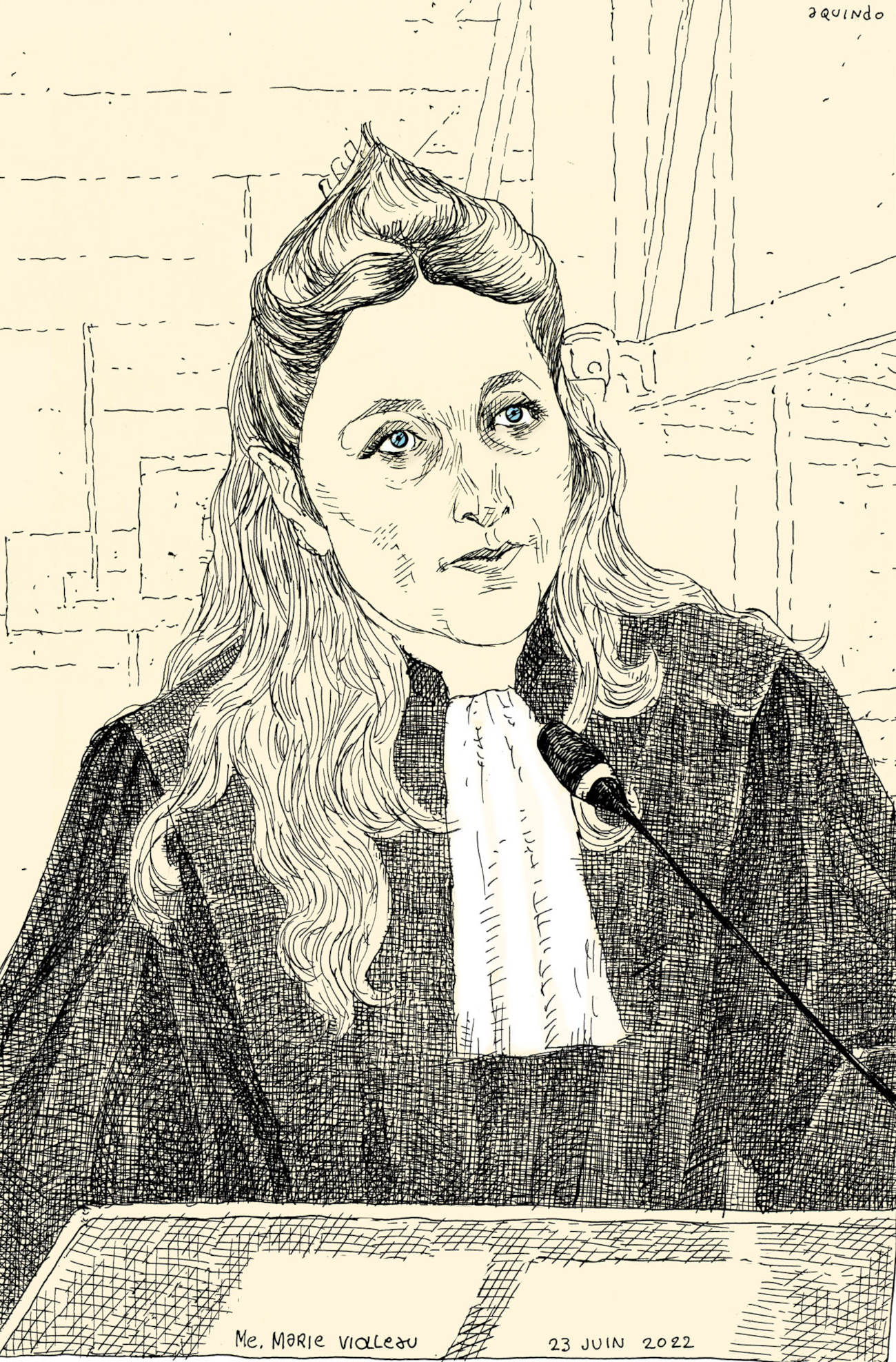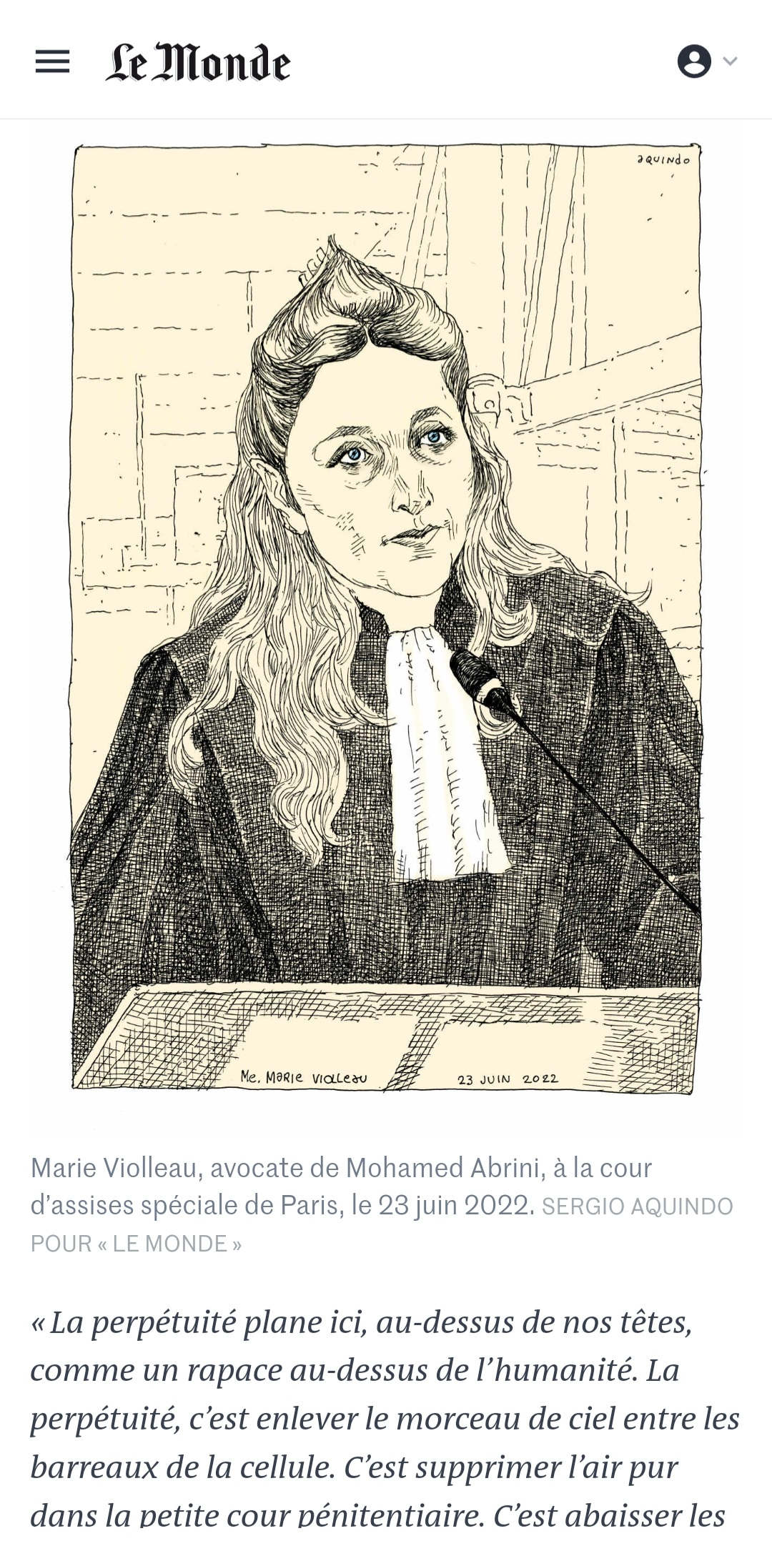De septembre 2021 à juin 2022 j’ai suivi pour Le Monde le procès des attentats du 13 novembre 2015 au Palais de Justice de Paris. Un défi humain et artistique, d’autant que c’était ma première expérience dans le « dessin judiciaire ». Il fallait dessiner sur des bancs pas très confortables, suivre les témoignages éprouvants des familles endeuillées, des survivants, des accusés, croiser leur regard, visionner des vidéos épouvantables et cela, tout en veillant à garder un trait précis, libre, et sensible à la fois. Un des moments marquants fut l’audition d’un des parents des terroristes du Bataclan, incapable de répondre des actes de son fils. Aussi, la dignité des familles des victimes et des survivants forçait le respect, tout comme le travail des avocats de la défense pour faire entendre une autre musique, au sein de ce « procès cathédrale » où tout semblait joué d’avance. Une synthèse de cette expérience figure dans mon livre « Tout va mal », publié aux éditions Rackham en 2025.